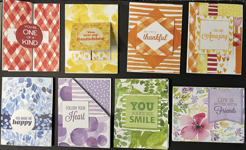 8 cards using watercolor-inspired patterned papers filled with soft washes of color, artistic textures, and dreamy blends.