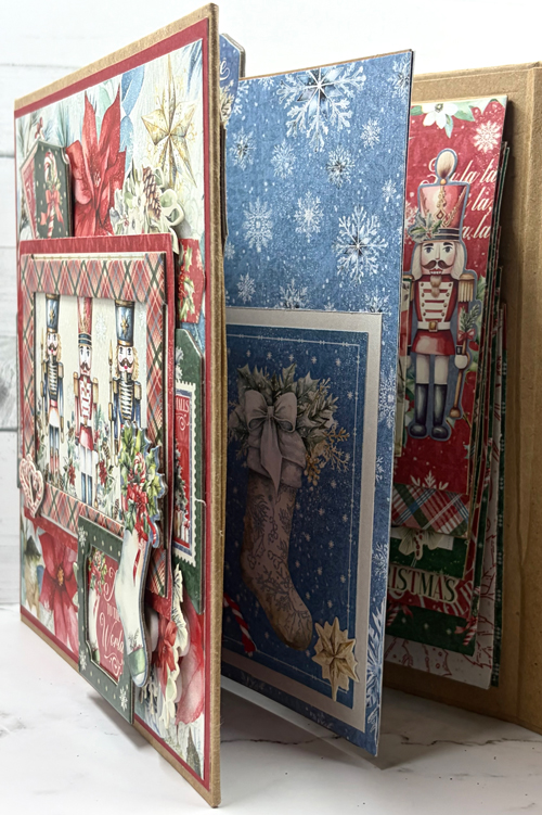 Create a beautifully detailed holiday trifold waterfall folio album filled with classic Christmas charm, rich layers, and interactive surprises. A big perk is this album comes pre-built, we will be covering and embellishing the entire time. This album features waterfall pages, flaps, pockets, tuck spots, and layered panels. There is ample space to fill your album with photos and journaling. Looking for more Graphic 45 album kits? Subscribe to our G45 Album Kit Club online. General album size is 7.5" w x 7.5" h x 1.25" d.