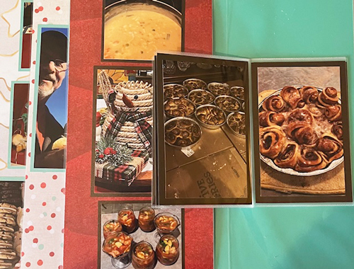 Participants will receive 1 CM top loading 12x12 page, 1 sheet of Island Waters Cardstock, coordinating paper from the Cookie Exchange paper pack, 6x12 Peek a Boo Pockets and the new Cascading Spacer Set